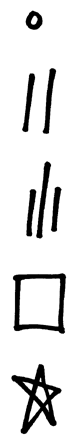 | Zählen | = zuordnen eines dings zu einem zeichen. Eine grössere menge ist so nicht handhabbar, sie muss benannt werden und in ein system (Bündelung) eingebunden werden. Die zählgrenze ist so auch ausdruck für abstraktionsvermögen. | ![]() |